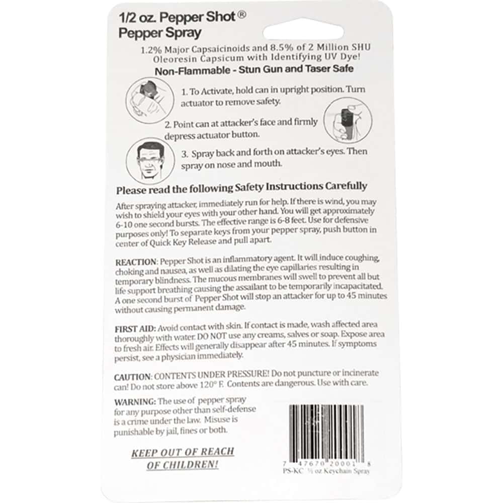 The Pepper Shot 1.2% MC ½ oz Pepper Spray with Belt Clip and Quick Release Keychain. Features include Stream Spray, 6-10 Bursts, 2 Million SHU.